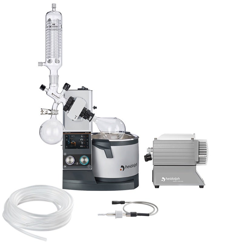 Hei-VAP Reaksjonsuttrekkspakke inkluderer Expert Control med motorløft, glassutstyrsett, vakuumpumpe, temperatursensor og slangesett.
